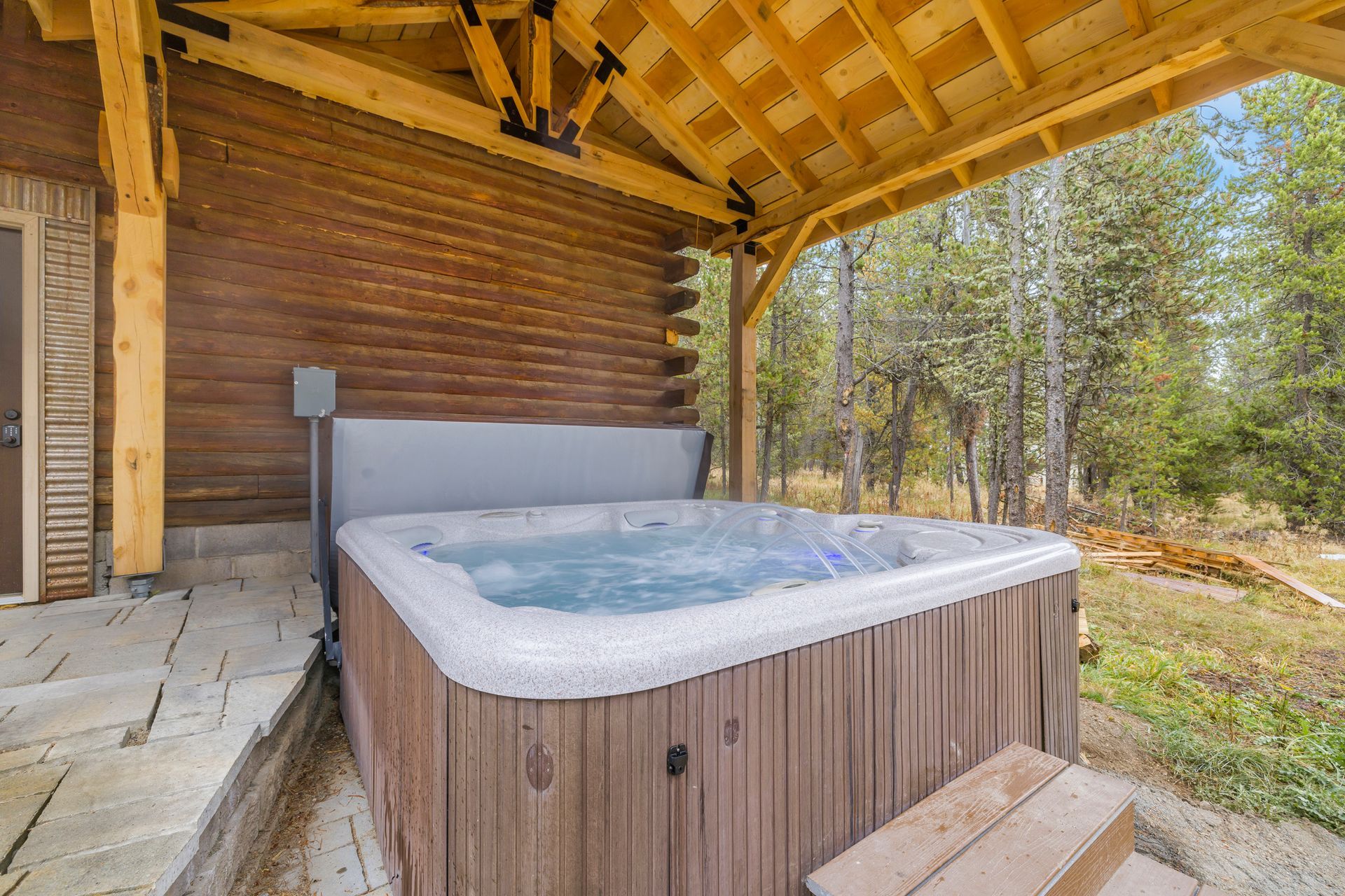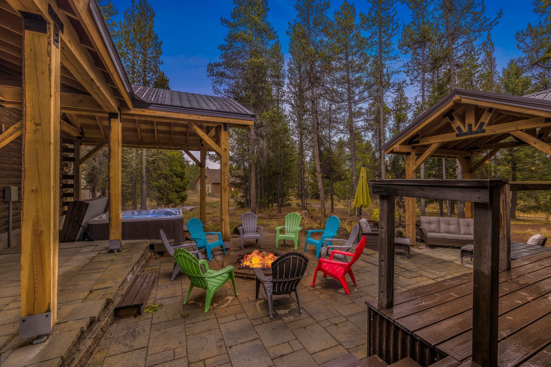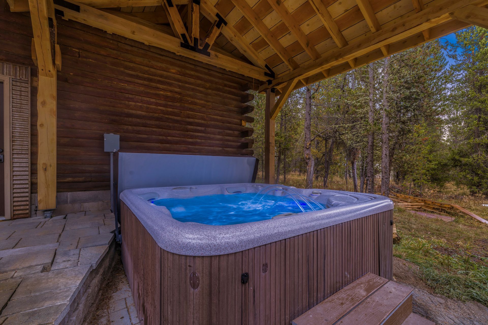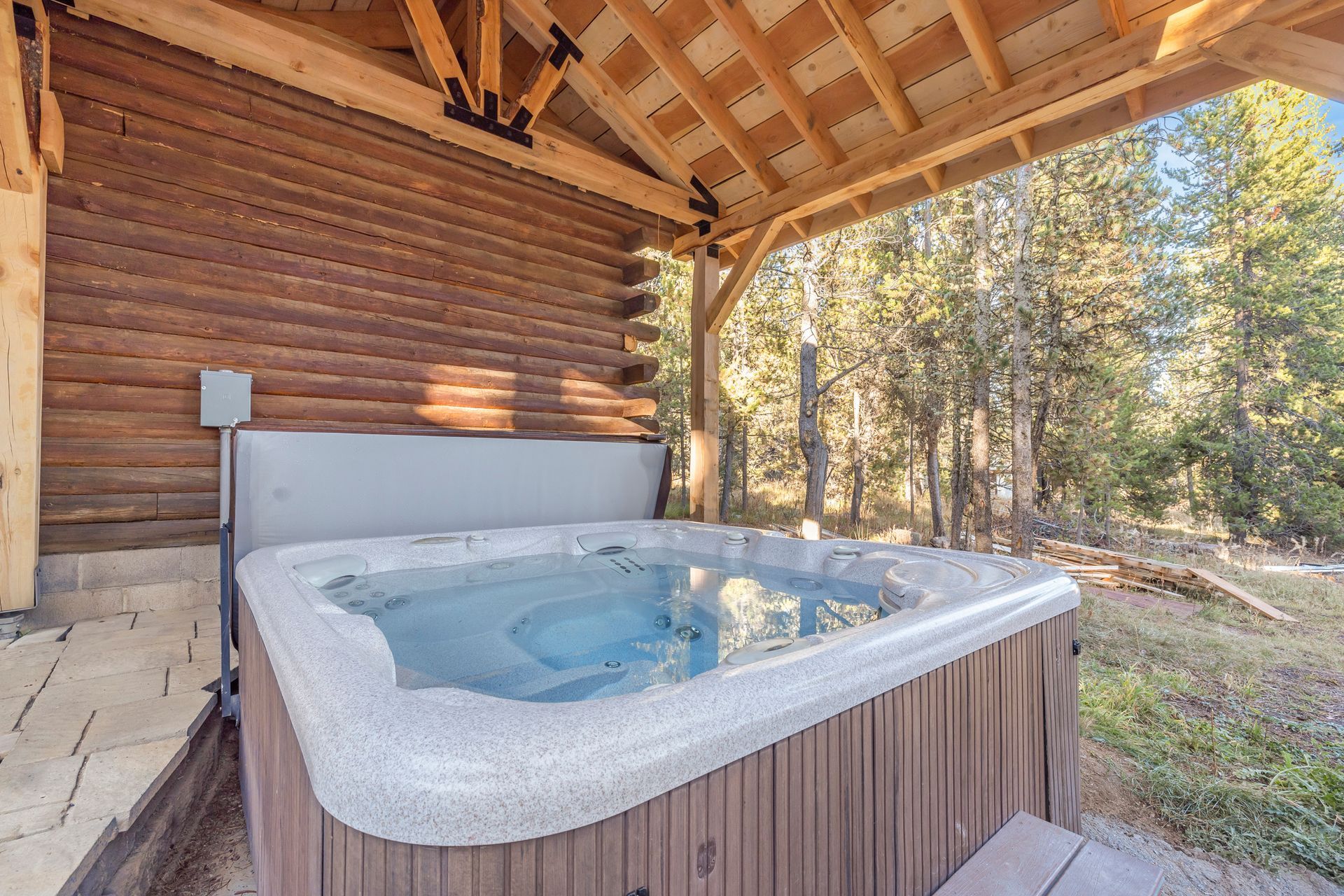 Enjoy the outdoor area for relaxing fires or a soak in the hot tub in its all natural landscaping. Surrounded with outdoor lighting and pine trees.
