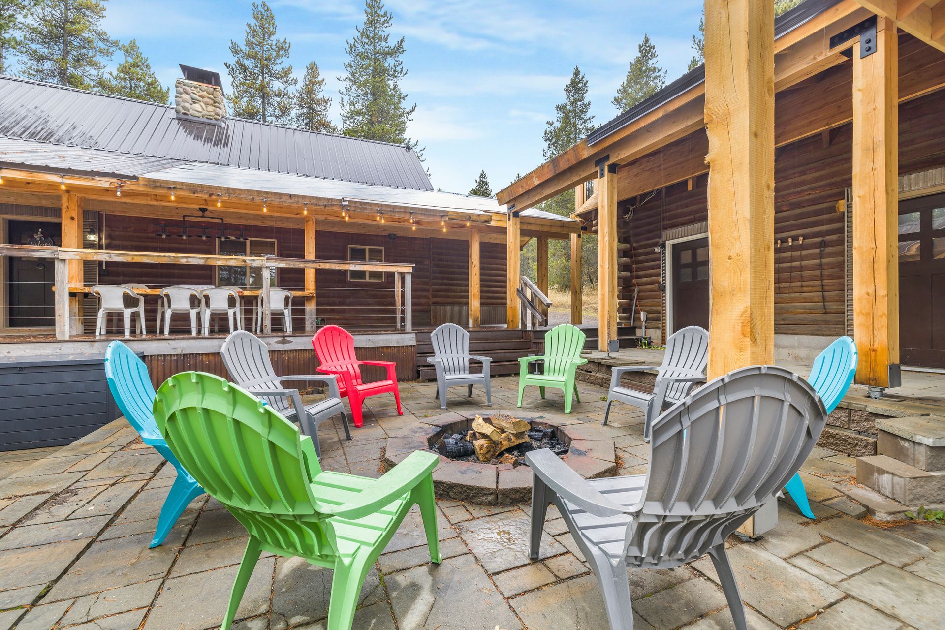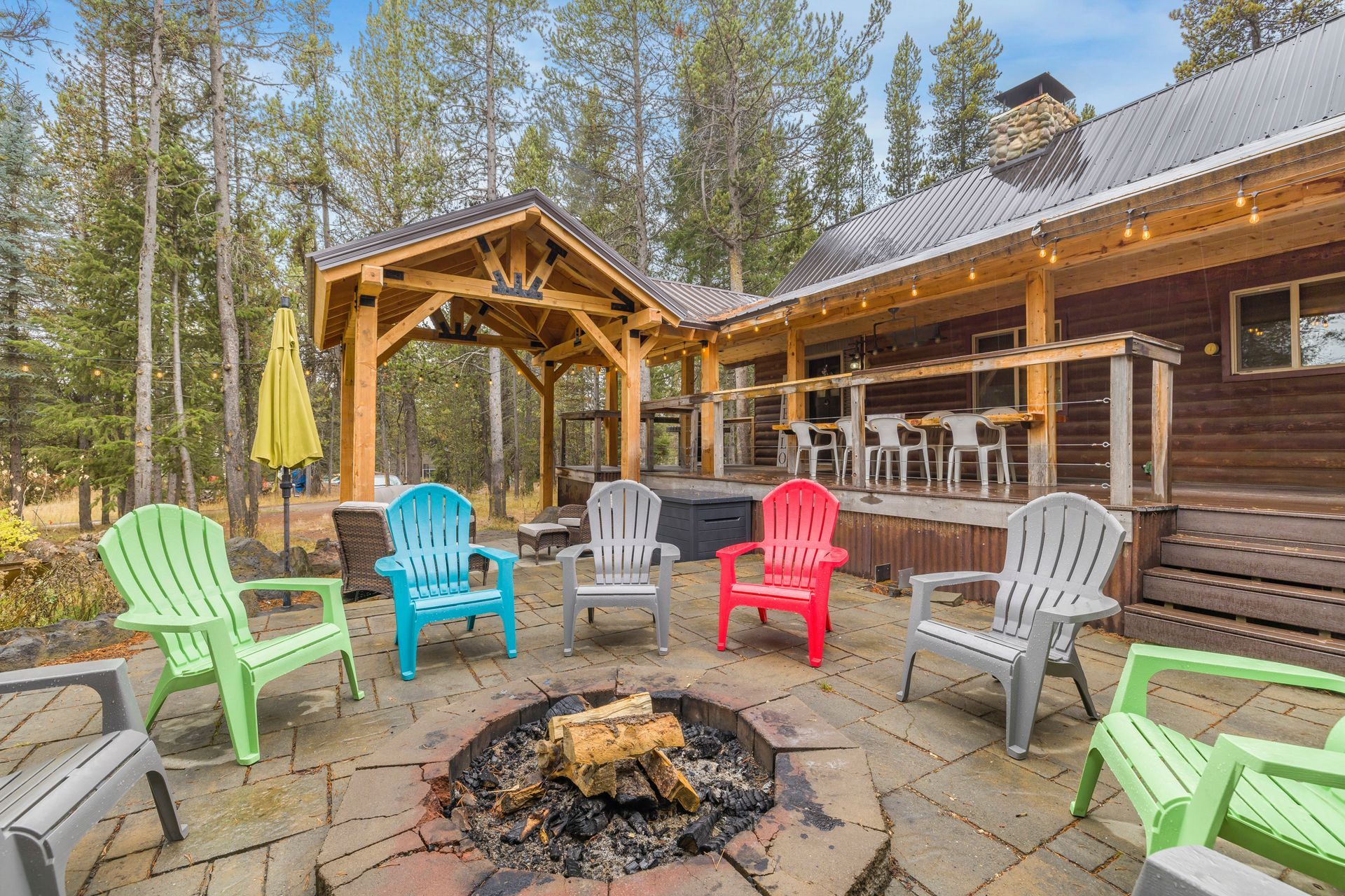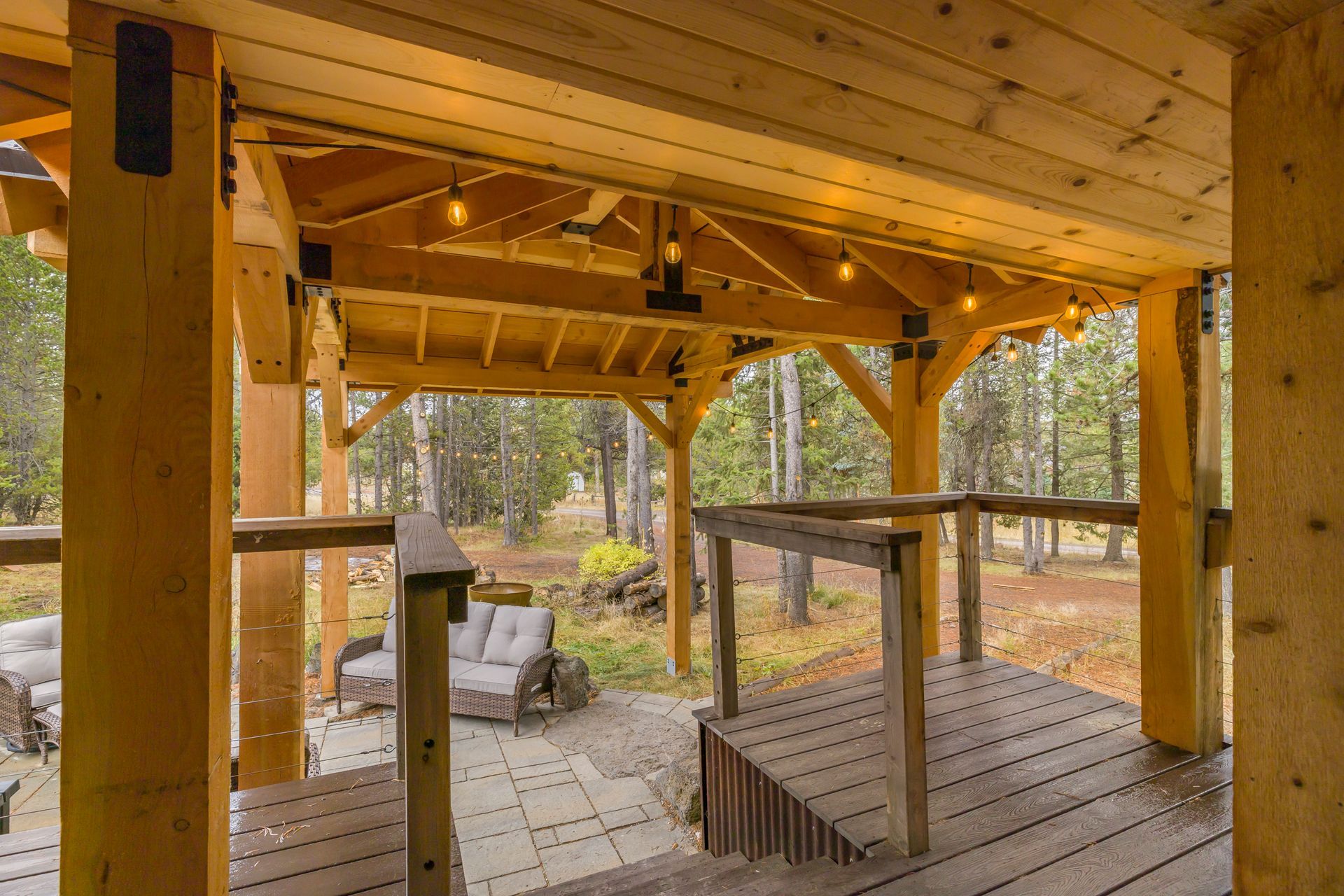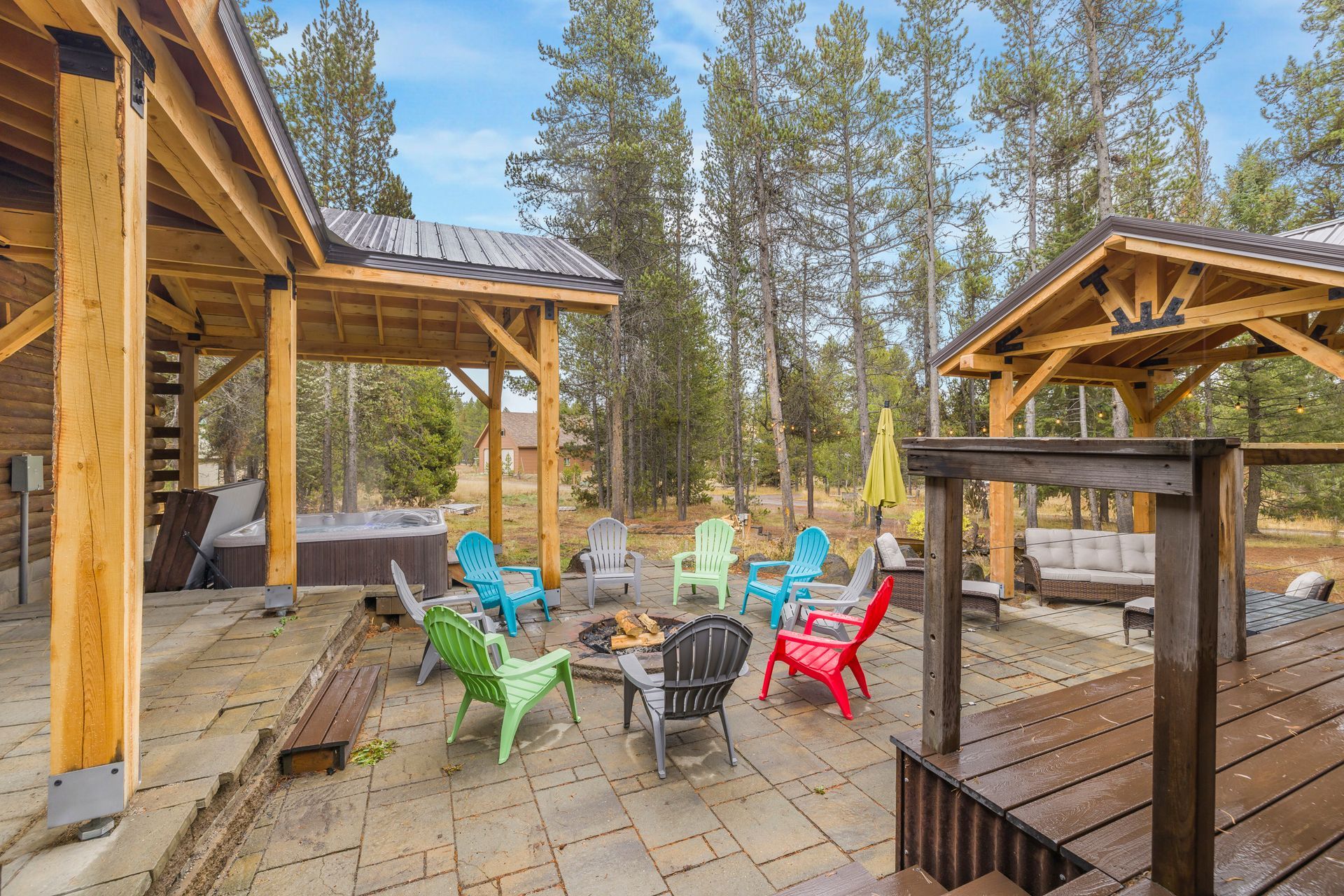 Enjoy the outdoor area for relaxing fires or a soak in the hot tub in its all natural landscaping. Surrounded with outdoor lighting and pine trees.